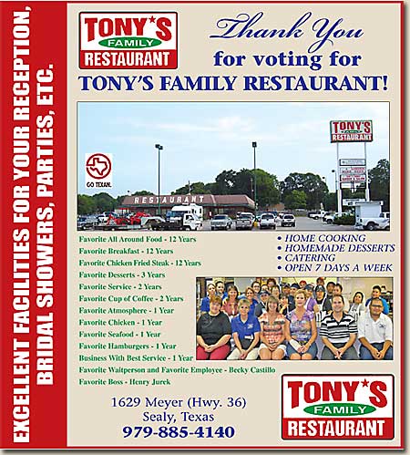 We realize how hectic everyone's schedule is, so we offer hot steam table meals for dinner as well as lunch. It is a great way for families on the go to eat a healthy meal because it is so quick and it allows time for them to eat together. For their hard work, and diverse menu, the restaurant was awarded an honorable mention nod in the December 2008 Texas Monthly as one of the top forty restaurants in Texas small towns. In Austin County, the restaurant was voted to have the best all around food, best breakfast, and best chicken fried steak for Ten Years and was named best service at a restaurant Seven Years. Specialties include Hamburger Steaks, Fried Chicken, Chicken Fried Steak, Chicken Fried Chicken, Fried Catfish and Liver and Onions, among other country favorites. The restaurant also does a homemade soup each day, a favorite with customers.