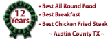 We realize how hectic everyone's schedule is, so we offer hot steam table meals for dinner as well as lunch. It is a great way for families on the go to eat a healthy meal because it is so quick and it allows time for them to eat together. For their hard work, and diverse menu, the restaurant was awarded an honorable mention nod in the December 2008 Texas Monthly as one of the top forty restaurants in Texas small towns. In Austin County, the restaurant was voted to have the best all around food, best breakfast, and best chicken fried steak for Ten Years and was named best service at a restaurant Seven Years. Specialties include Hamburger Steaks, Fried Chicken, Chicken Fried Steak, Chicken Fried Chicken, Fried Catfish and Liver and Onions, among other country favorites. The restaurant also does a homemade soup each day, a favorite with customers.